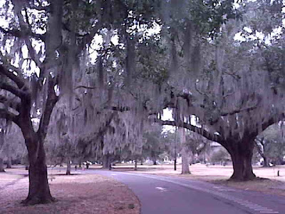 Spanish moss on trees in Audubon Park. How about this little story found on Wikipedia: There was once a traveler who came with his Spanish fiancée in the 1700s to start a plantation near the city of Charleston SC. She was a beautiful bride-to-be with long flowing raven hair. As the couple was walking over the plantation site near the forest, making plans for their future, they were suddenly attacked by a band of Cherokee who were not happy to share the land of their forefathers with strangers. As a final warning to stay away from the Cherokee nation, they cut off the long dark hair of the bride-to-be and threw it up in an old live oak tree. As the people came back day after day and week after week, they began to notice the hair had shriveled and turned grey and had begun spreading from tree to tree. Over the years the moss spread from South Carolina to Georgia and Florida. To this day, if one stands under a live oak tree, one will see the moss jump from tree to tree and defend itself with a large army of beetles.